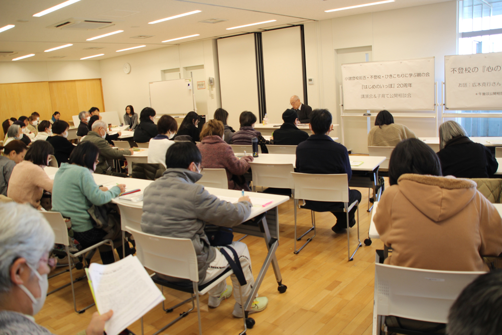 この日は、不登校の子どもと親の相談に長年携わっている神戸大名誉教授の広木克行さんが、「不登校の心の傷が癒えるとは」と題して講演した後、数人の参加者が悩みなどを広木さんに相談して、全員で共有する公開相談会を行った。