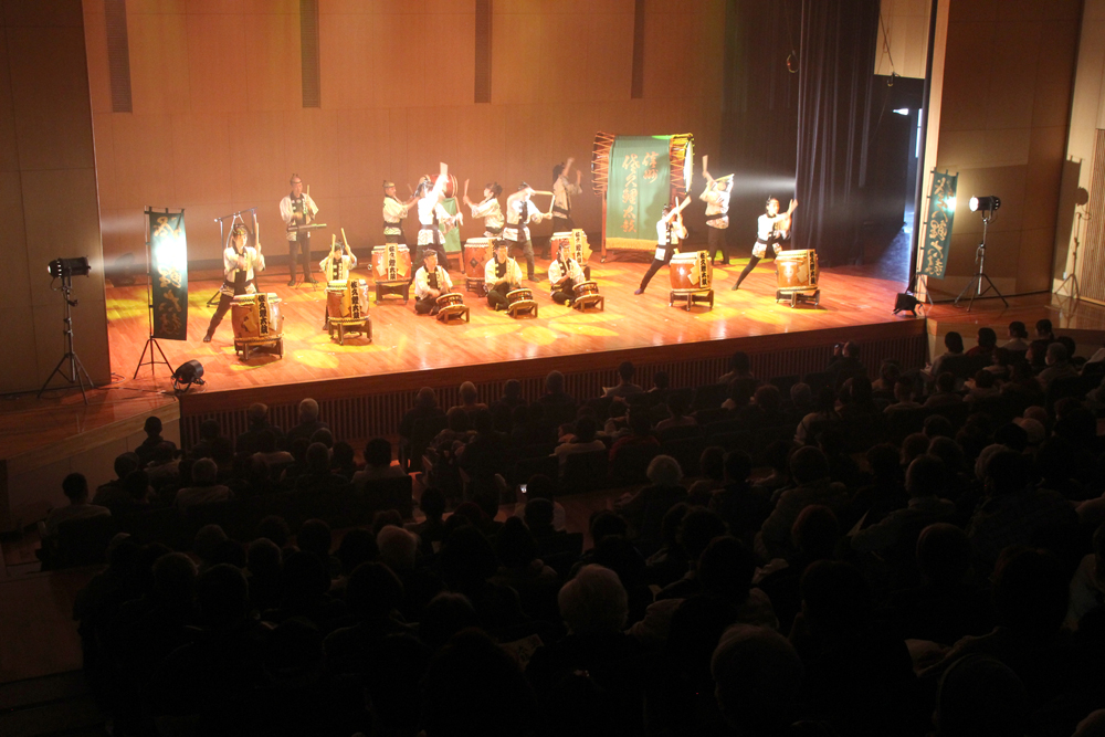 佐久市内で活動する4つの太鼓団体が一堂に会した「信州佐久太鼓の共演」は1日に開き、佐久市浅科の交流文化館浅科ホールを会場に集まった350人の観客に勇壮な演奏を届けた。
